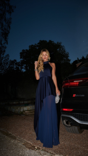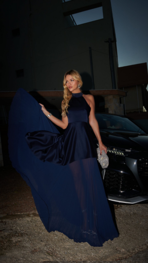 Ένα εξαιρετικό κομμάτι από την πασαρέλα, αυτό το ασύμμετρο σατέν φόρεμα διαθέτει πλισέ φούστα από πολυτελές σατέν και λεπτό μουσελίνα. Το γλυπτικό γιακά με ακατέργαστα άκρα οδηγεί με χάρη σε μια ανοιχτή πλάτη, δημιουργώντας μια εντυπωσιακή ισορροπία μεταξύ μοντέρνας κομψότητας και τολμηρής εκλεπτυσμένης αισθητικής. Ντυμένο σε ένα βαθύ βασιλικό χρώμα, το φόρεμα Royal Blue Aura ενσαρκώνει τη σύγχρονη γοητεία, καθιστώντας το μια δήλωση εκλεπτυσμένης πολυτέλειας και υψηλής μόδας.