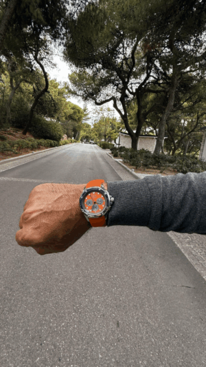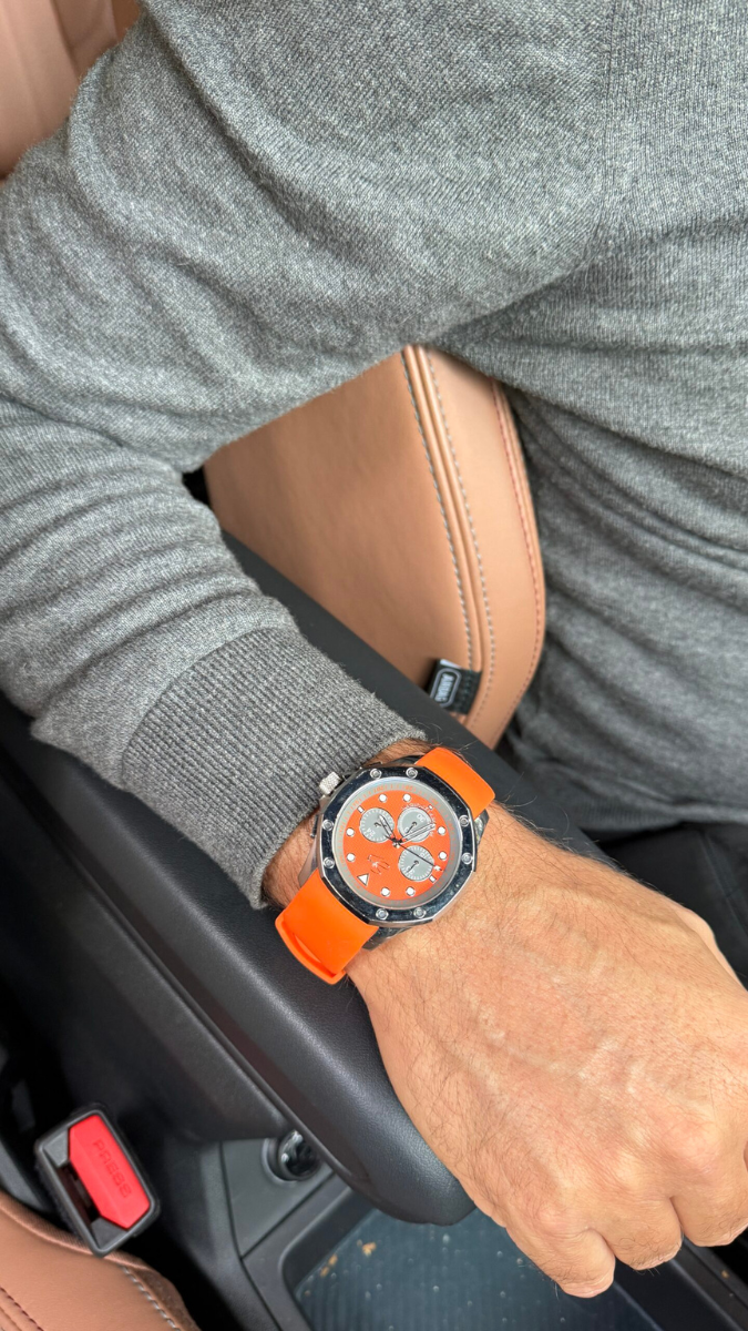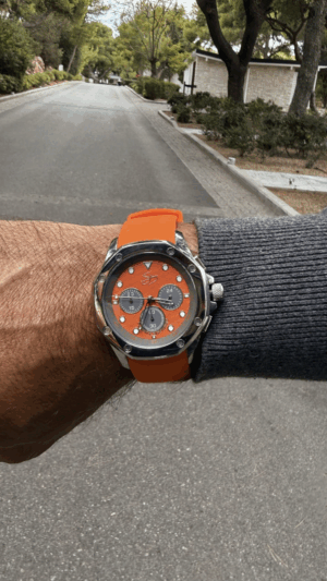 A bold statement in timekeeping, the Midnight Ember Orange combines precision engineering with fiery elegance. Its vibrant dial, sculpted case, and Finestra chronograph detailing make this watch a modern icon for the discerning collector.