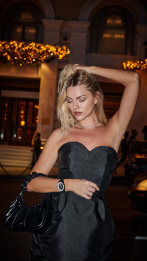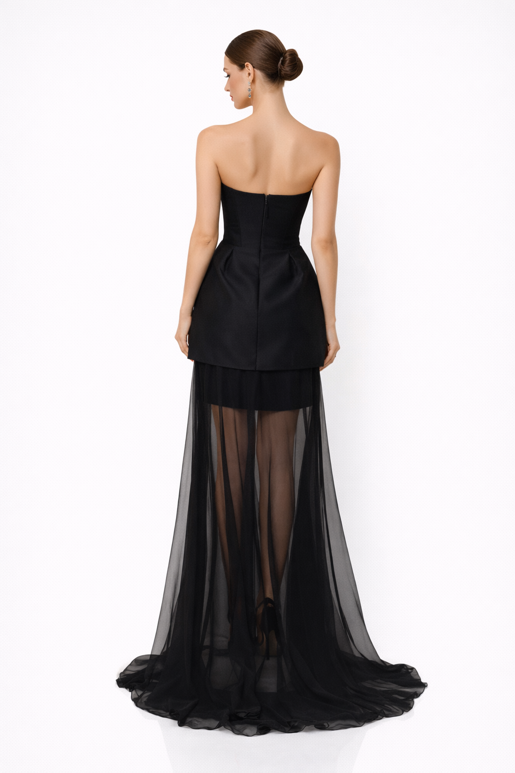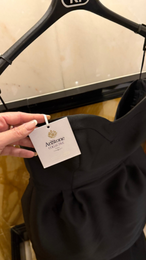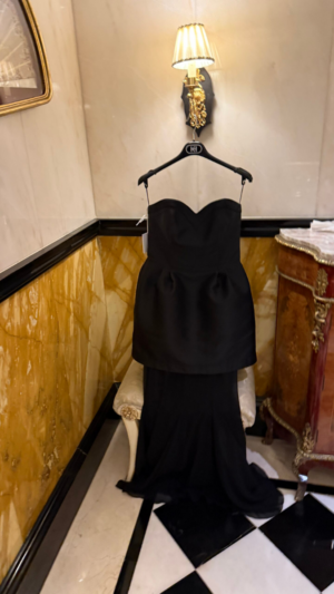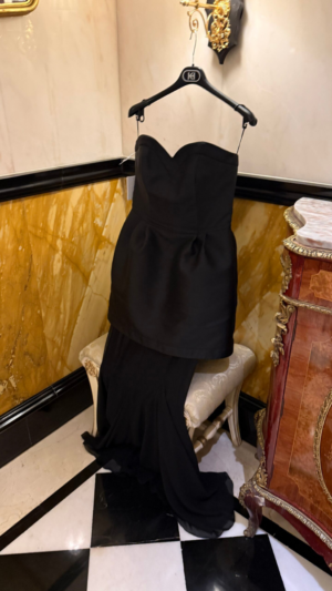 A refined strapless tulip dress crafted from luxurious mikado and muslin fabrics, with a soft viscose lining for comfort. The skirt features a subtle angular detail, adding architectural elegance and movement to this timeless piece. Perfectly balancing structure and fluidity, it embodies Aristone’s signature sophistication. Haute Couture Runway dress crafted in Aristone old money aesthetics by one of the oldest and most prestigious greek fashion atelier .